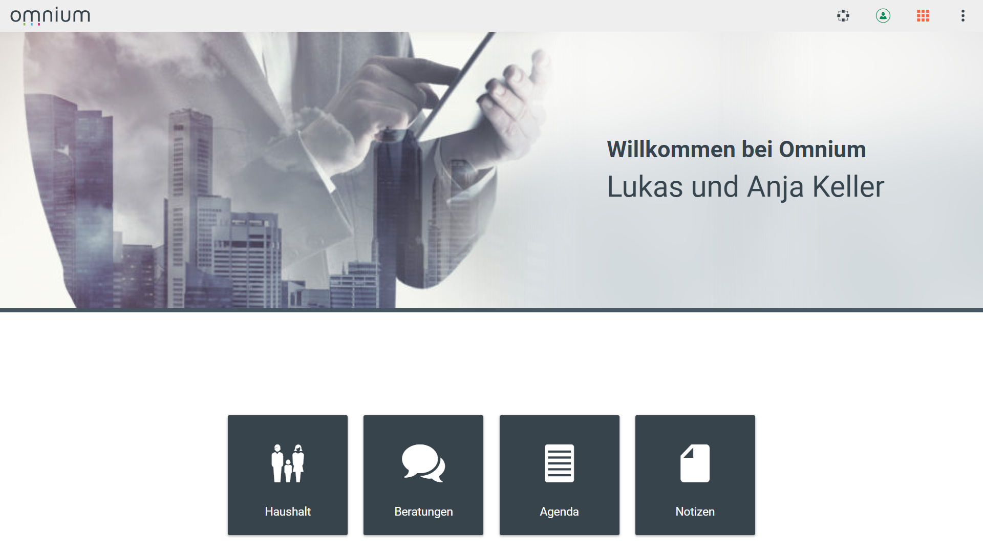 Das Cockpit ist der Einstiegspunkt für den Berater und den Kunden in die vielfältige Beratungswelt von Omnium. Zwei gesonderte Bereiche bieten dem Berater die ideale Trennung für die Gesprächsvorbereitung und das eigentliche Beratungsgespräch mit den dazu notwendigen Funktionen.