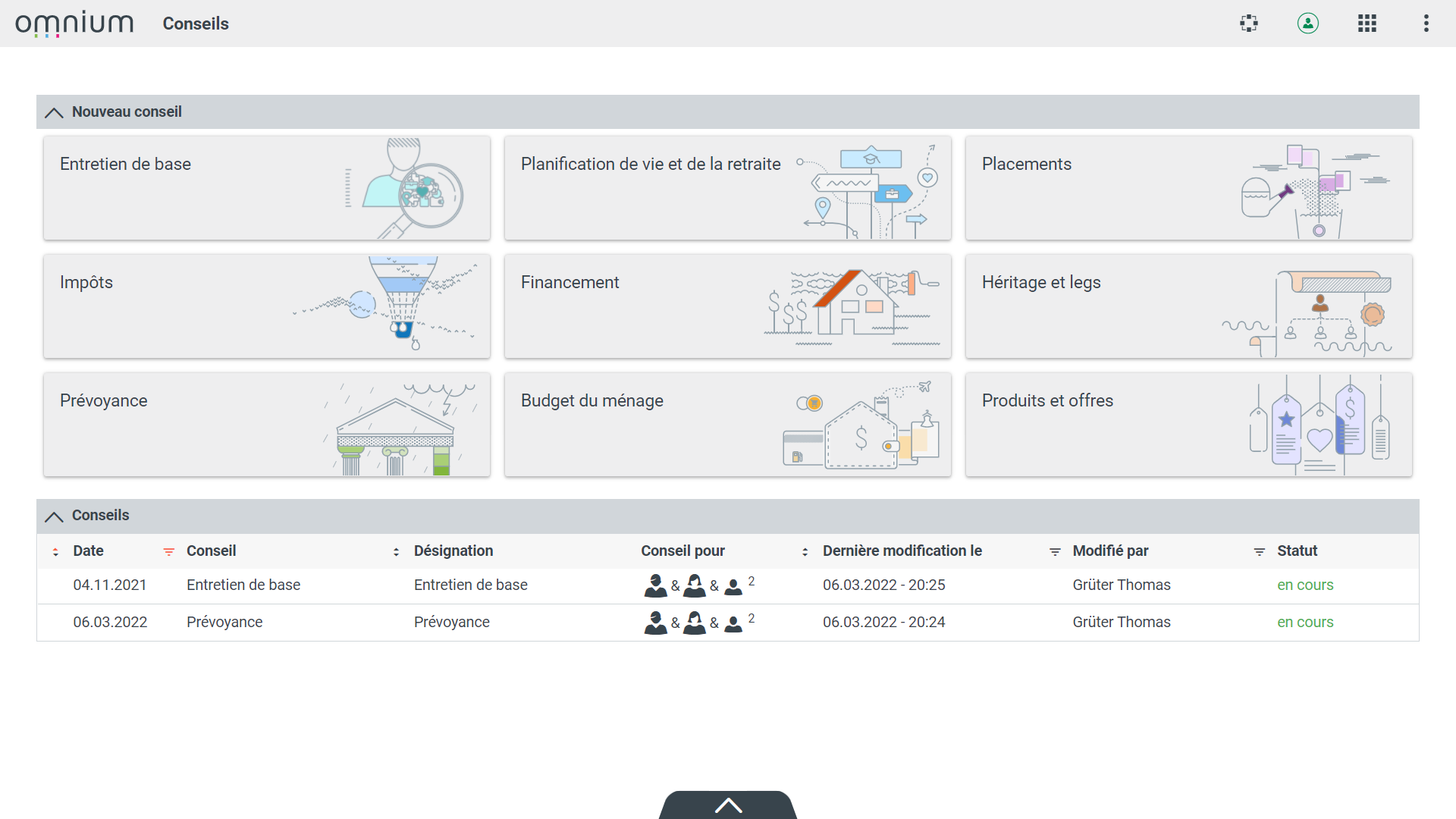 Le cockpit est le point d'entrée pour le conseiller et le client dans l'univers du conseil d'Omnium. Deux espaces distincts offrent au conseiller la séparation idéale pour la préparation de l'entretien et l'entretien de conseil proprement dit, avec les fonctions nécessaires à cet effet.
