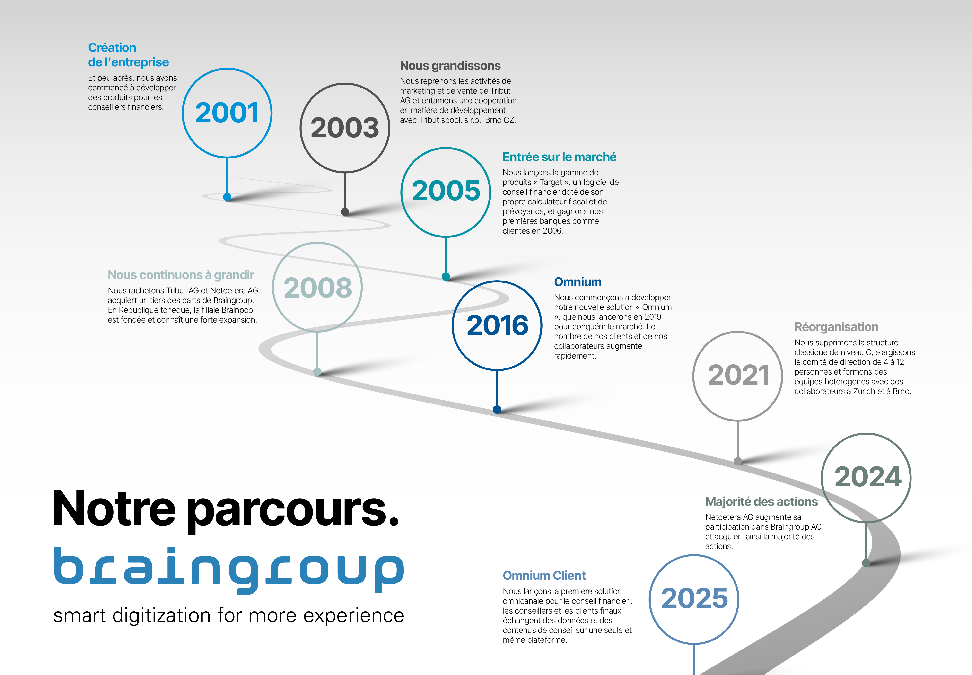 Qu'est-ce qui nous motive ? La passion de rendre le conseil financier plus simple, plus intelligent et plus efficace. Nos solutions combinent une technologie de conseil innovante et des processus de vente bien pensés, spécialement conçus pour les prestataires de services financiers. En collaboration avec notre partenaire G+D Netcetera, nous créons plus qu'un simple logiciel : tandis que Braingroup est synonyme d'outils de conseil intuitifs et tournés vers l'avenir, G+D Netcetera apporte des solutions mobiles et bancaires en ligne de pointe. Ce partenariat donne naissance à des solutions flexibles qui ne sont pas seulement convaincantes sur le plan technique, mais qui enthousiasment également vos clients.