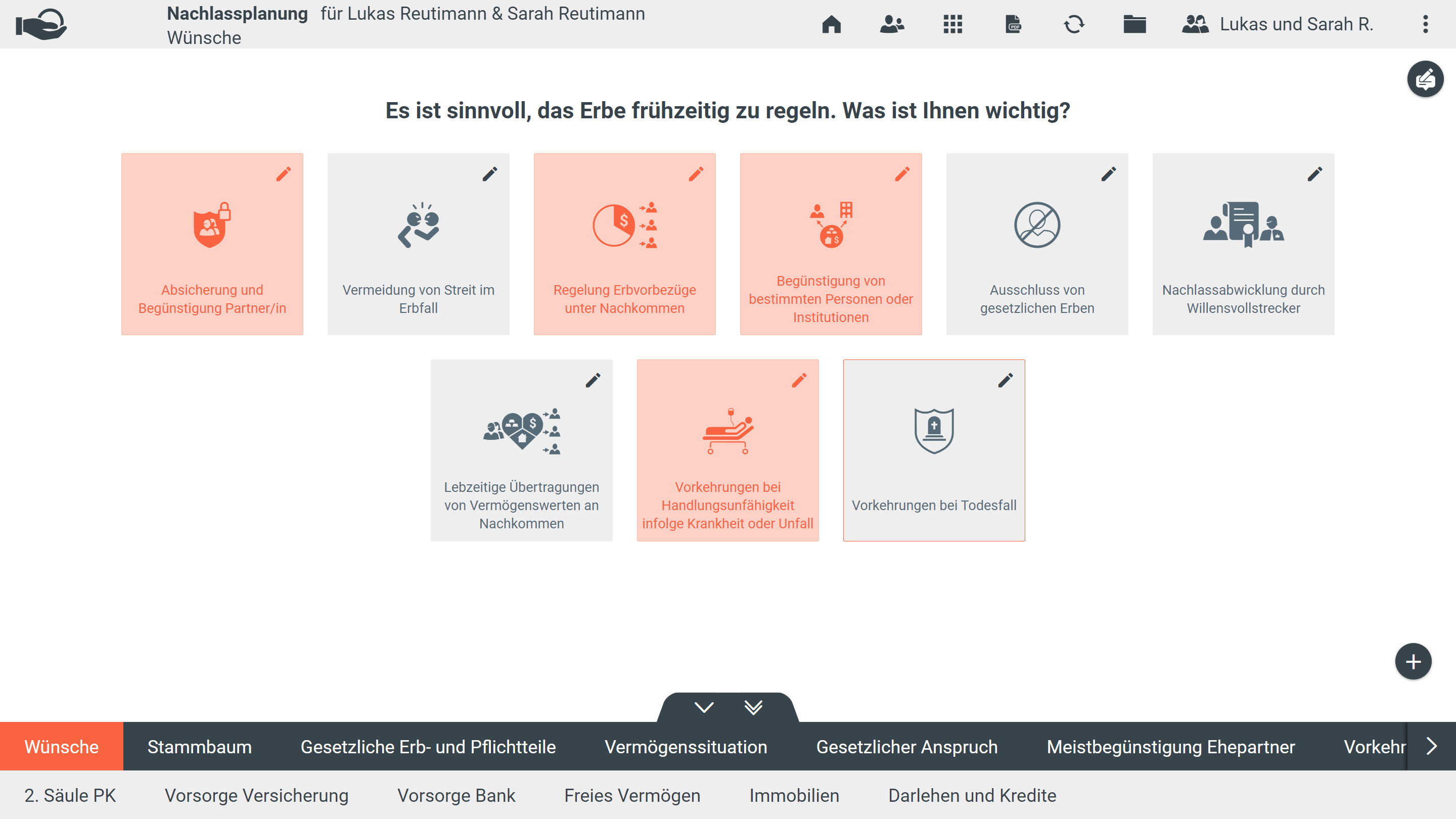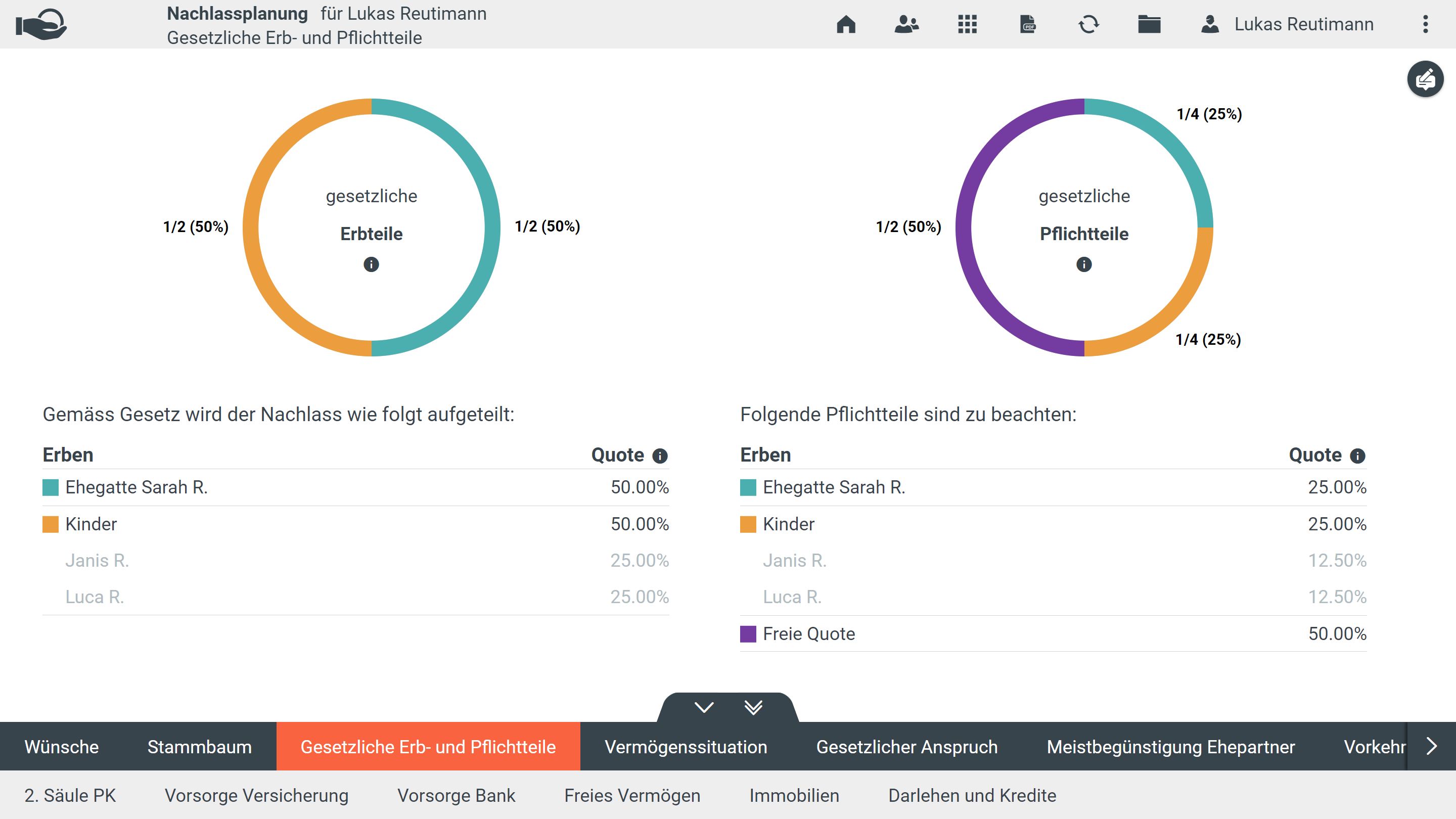Mit dem Modul Erben & Vererben werden die gesetzlichen Erbteile und Pflichtteile je nach Verwandtschaftsgrad ermittelt. Zudem kann aufgezeigt werden, wie ein Ehepartner durch Abschluss eines Ehevertrages (mit Vorschlagszuweisung) und Testament (Zuweisung verfügbare frei Quote) bestmöglich begünstigt werden kann (Meistbegünstigung Ehepartner).