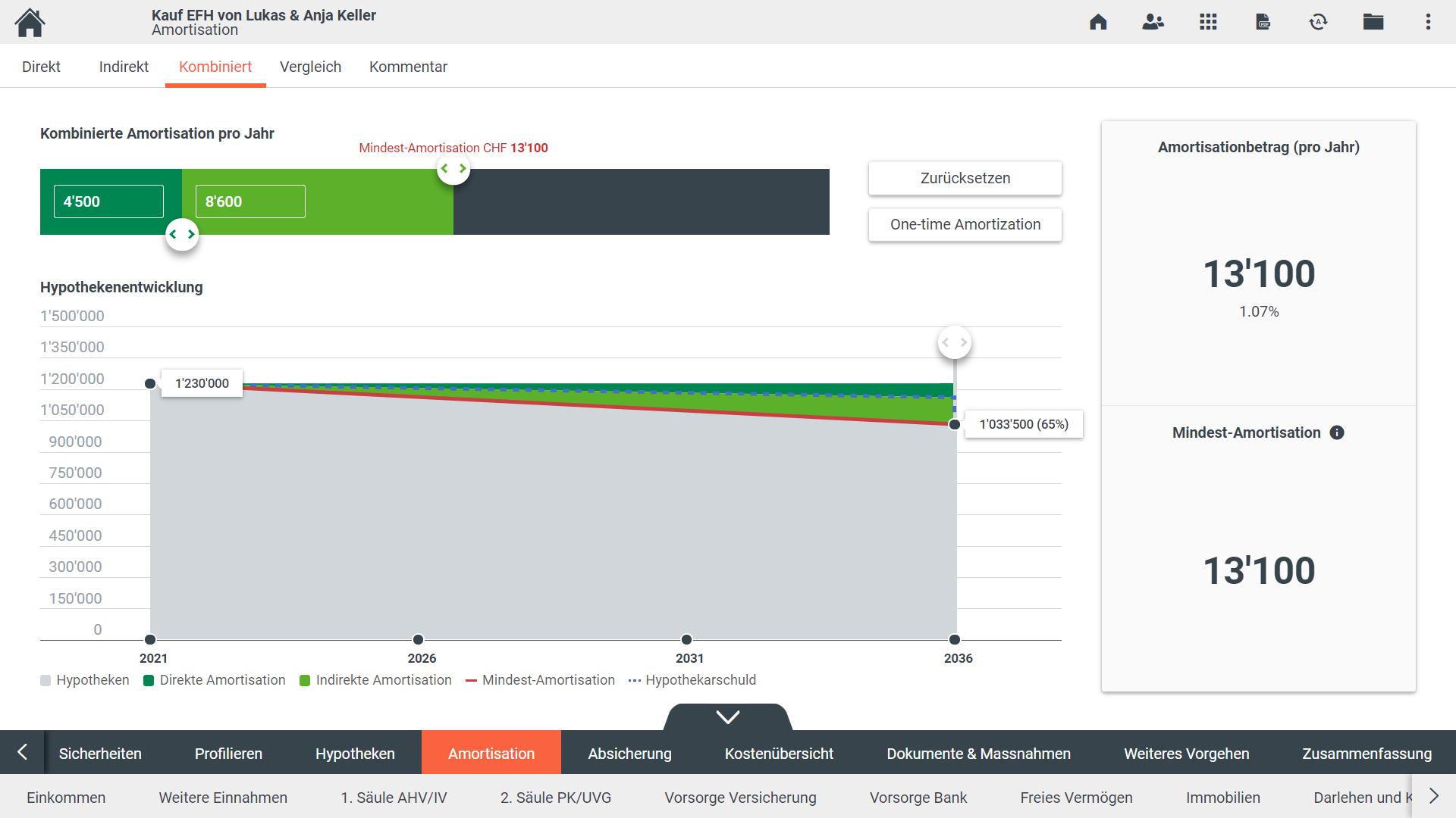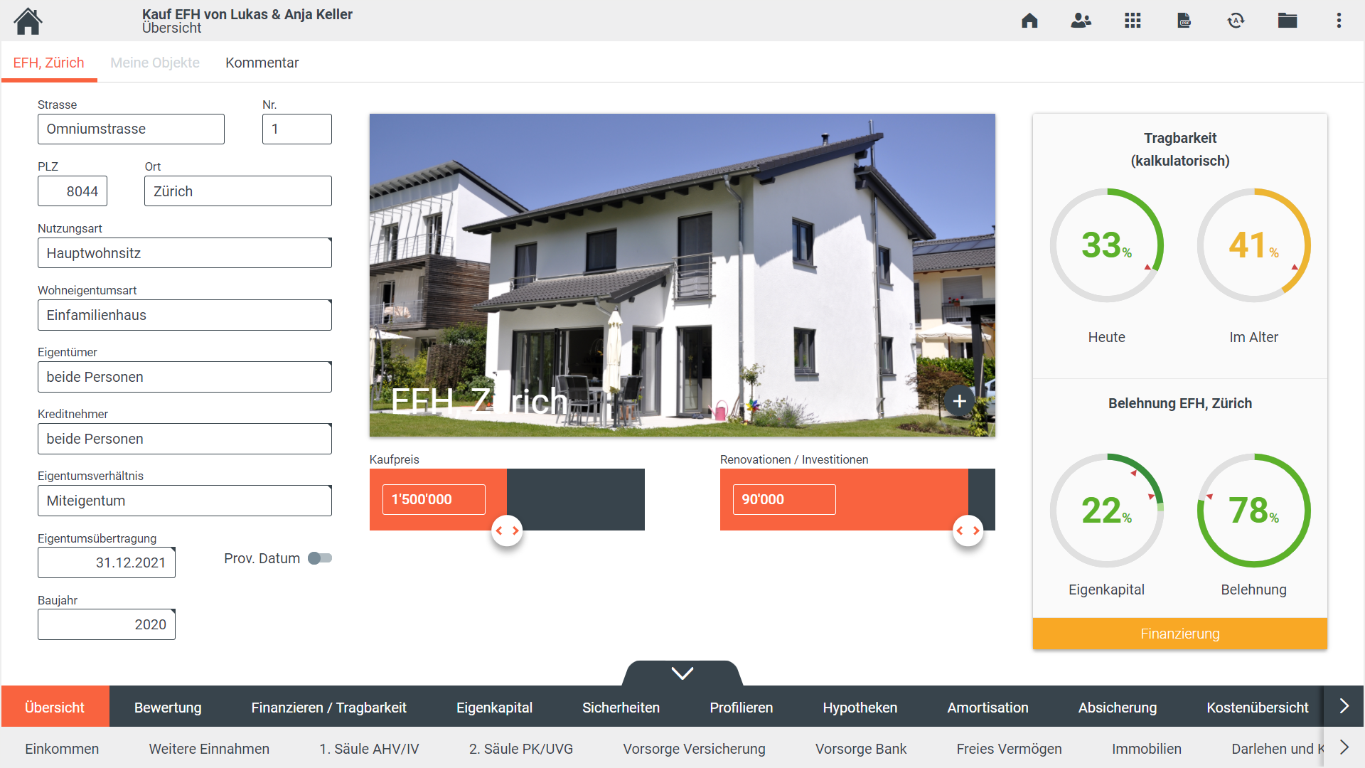 Das Modul Finanzieren bietet alles für eine umfassende Finanzierungsberatung für sämtliche Geschäftsfälle im privaten Wohnbau (Kauf, Neubau, Ablösung, Erhöhung, Änderung) bis zur verbindlichen Finanzierungs-Offerte. Dank verständlichen Visualisierungen, der nötigen Funktionstiefe und einer Vielzahl an Integrations- und Konfigurationsmöglichkeiten, lässt sich der Finanzierungsprozess flexibel abbilden.