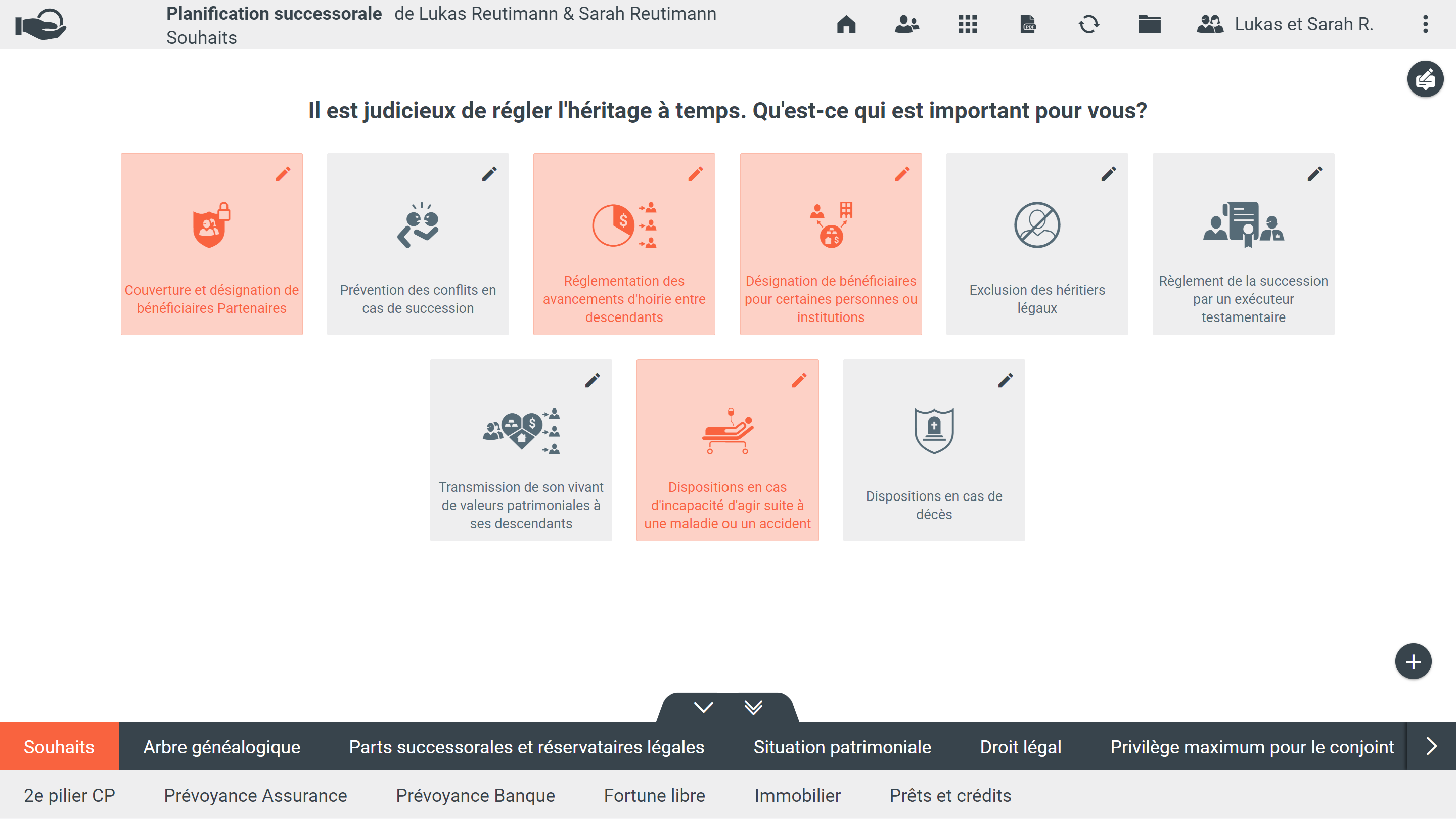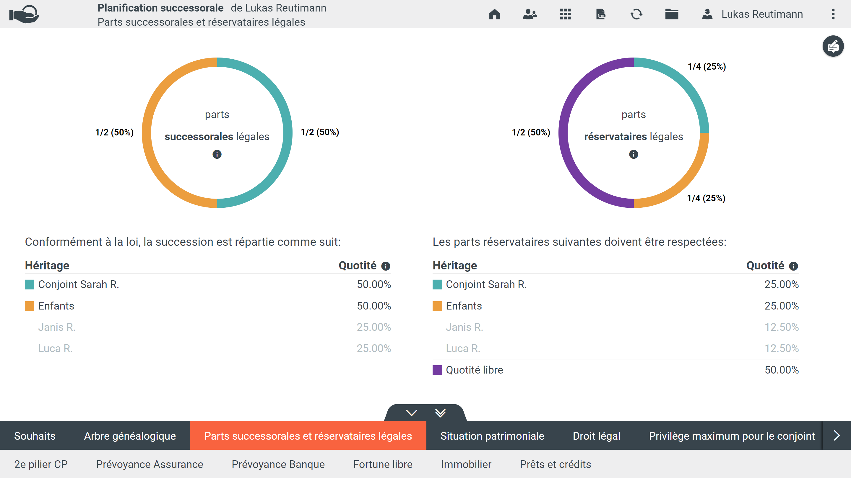Le module Héritage et legs permet de déterminer les parts successorales légales et les parts réservataires en fonction du degré de parenté. Il montre également comment avantager au mieux le conjoint, notamment par la conclusion d’un contrat de mariage (attribution du bénéfice) et d’un testament (attribution de la quotité disponible).
