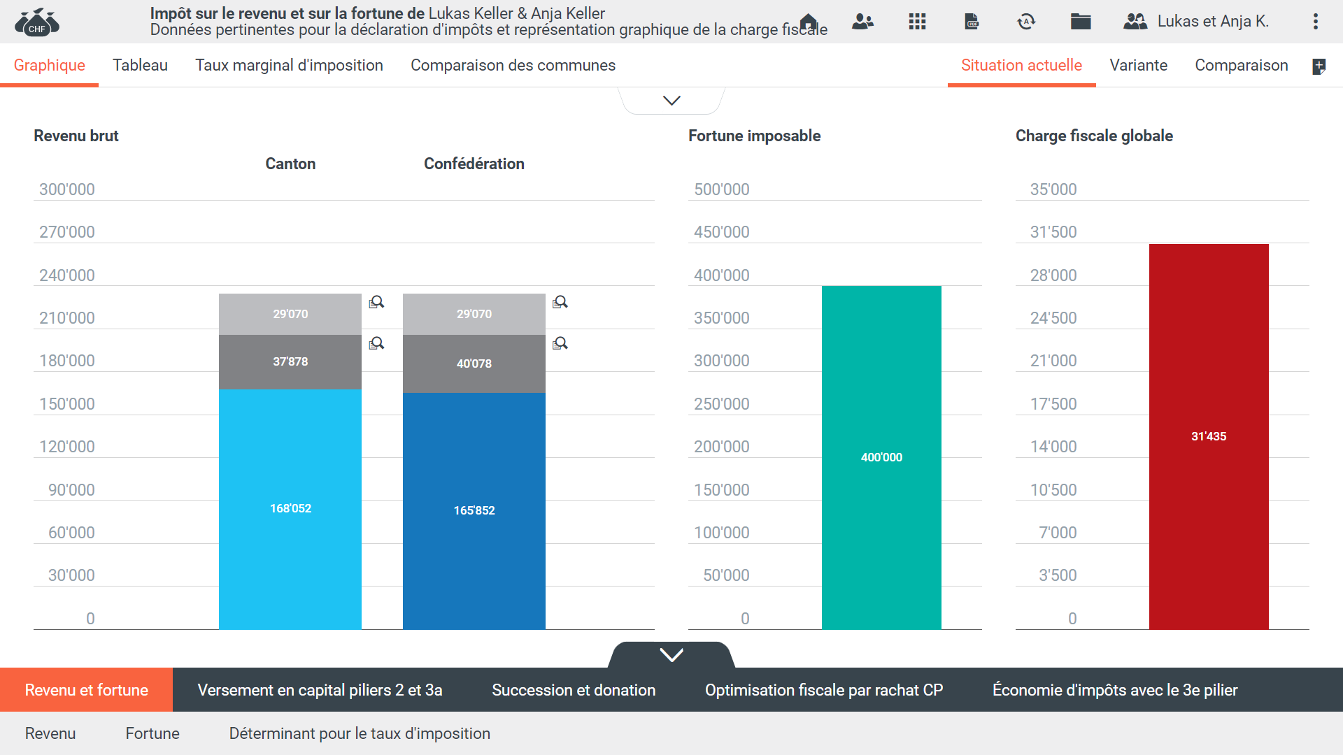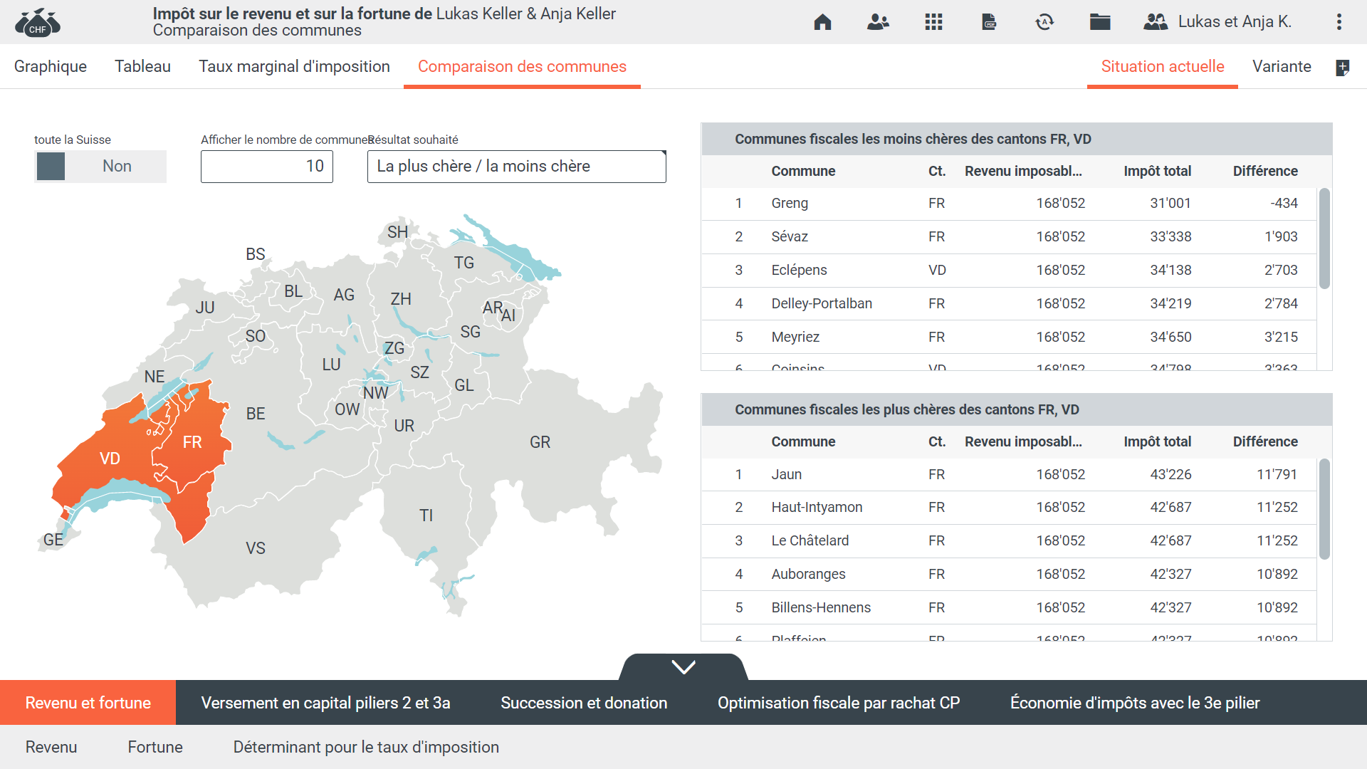 Le module Impôts prend en charge différents types d'impôts pour l'analyse de la situation actuelle et l'optimisation. Il permet de simuler des comparaisons complètes et de mettre en évidence les économies réalisables pour le client. Les données fiscales sont collectées dans toute la Suisse et mises à jour plusieurs fois par an. L'approvisionnement et la mise à jour des données sont effectués en interne.