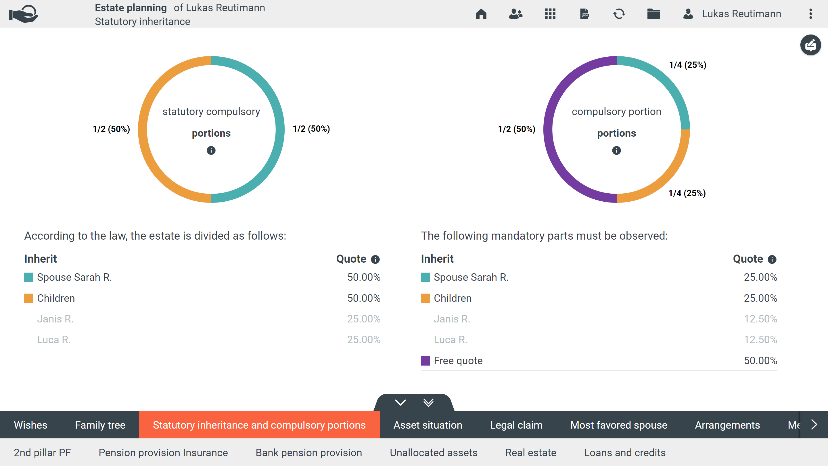 The Inheritance and bequeathing module calculates statutory inheritance shares and compulsory portions based on the degree of kinship. It also demonstrates how a spouse can be optimally benefited through a marital agreement (with advancement assignment) and a will (allocation of the disposable portion) to maximize spousal benefits.