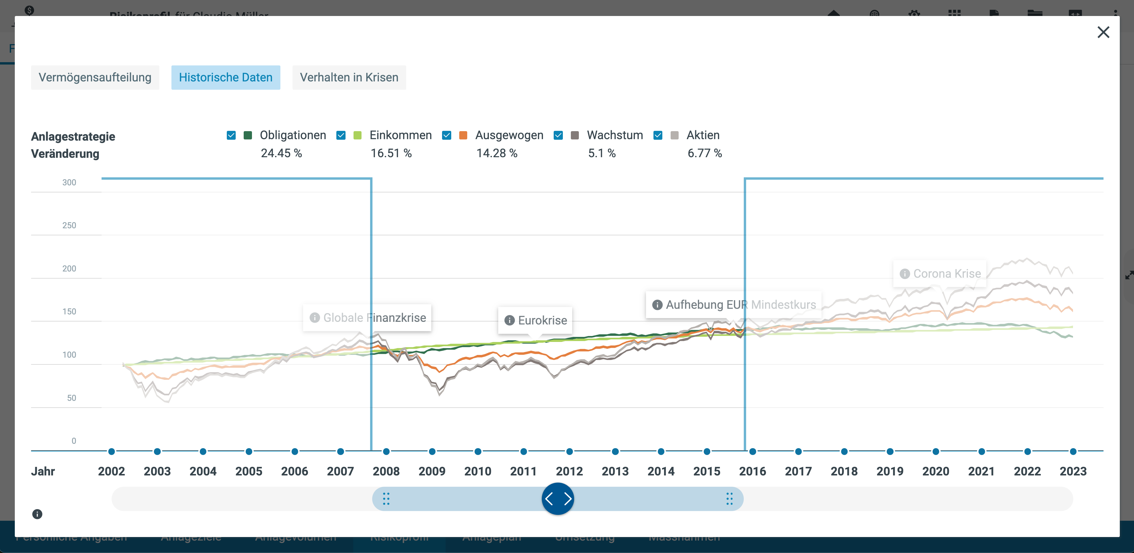 Das Modul Investieren verfolgt den Ansatz des zielbasierten Anlegens. Neben der Erfassung der finanziellen Situation und des Anlagevolumens werden Anlageziele definiert, welche anschliessend mit der passenden Strategie und Anlagelösung umgesetzt werden können.