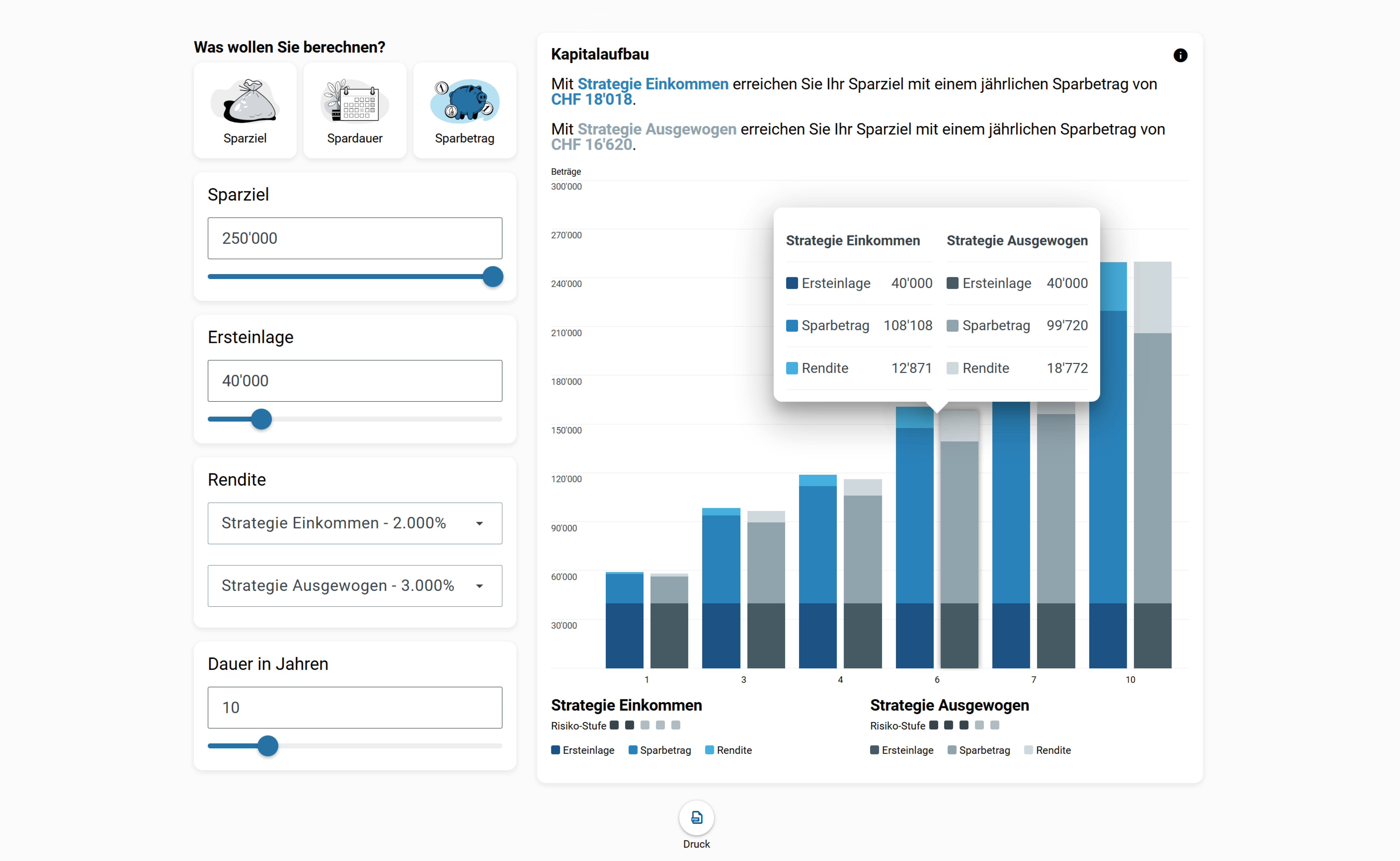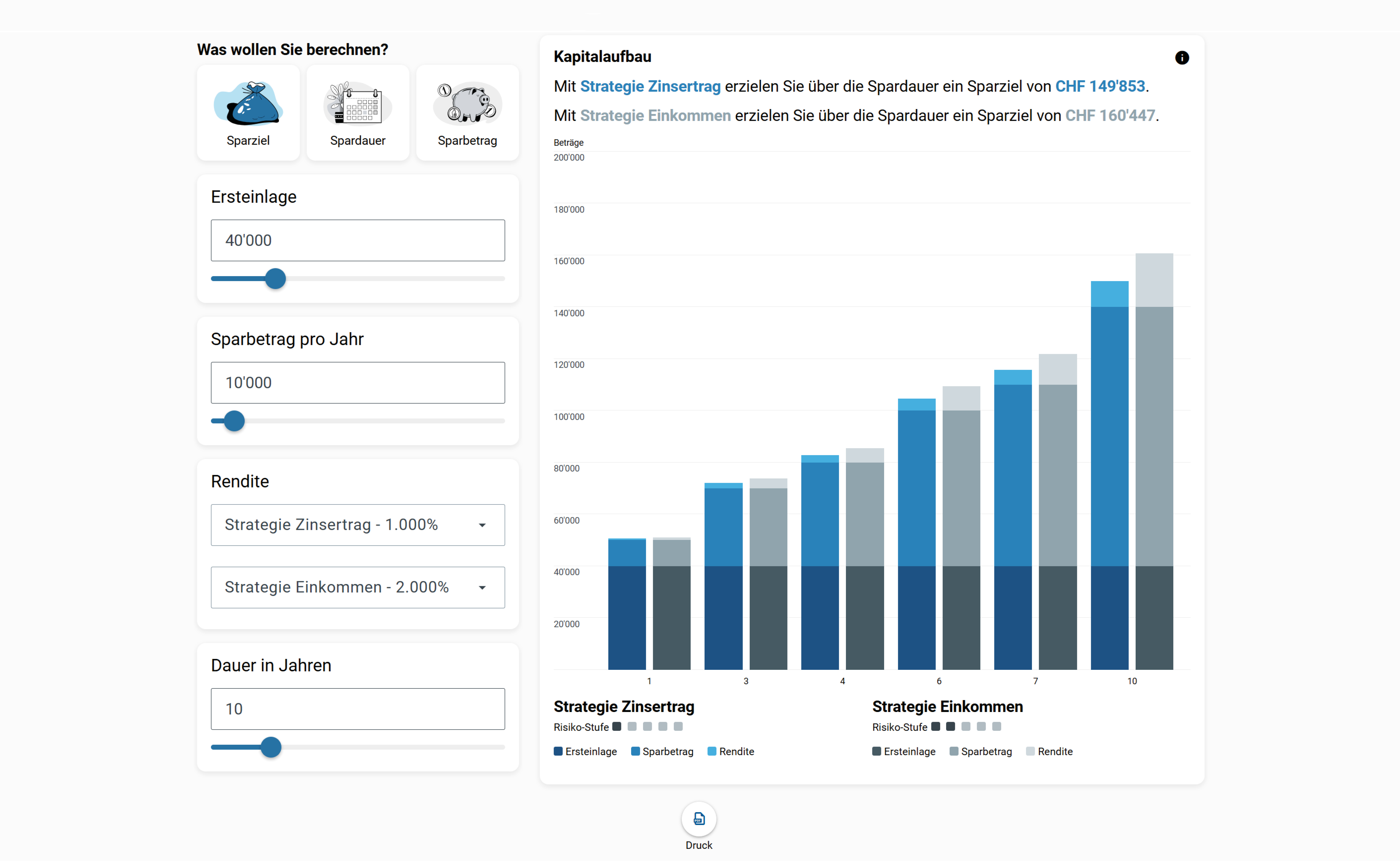 Berechnen Sie Ihr Sparziel basierend auf einer Ersteinlage, einem periodischen Sparbetrag, der Rendite sowie der Anlagedauer. Vergleichen Sie verschiedene Anlageprodukte und deren Rendite miteinander und finden Sie das passende Produkt. Es kann auch eine Berechnung der Spardauer bzw. des Sparbetrags erfolgen, sofern das Sparziel bekannt ist.