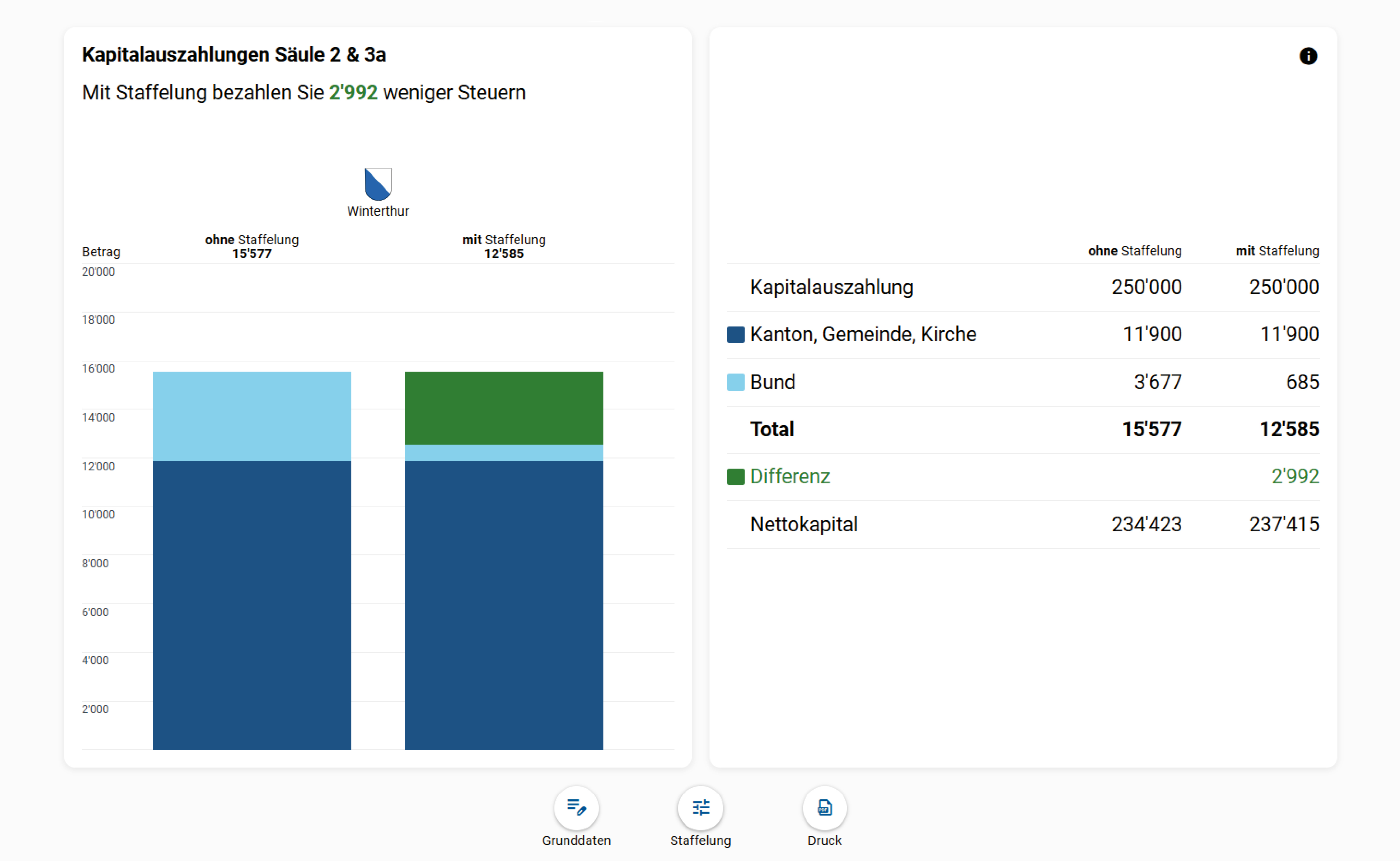 Mit wenigen Klicks berechnen Sie die Steuern auf Kapitalauszahlungen der gebundenen Vorsorge (Säule 2 und 3a) in einer beliebigen Wohngemeinde in der Schweiz.