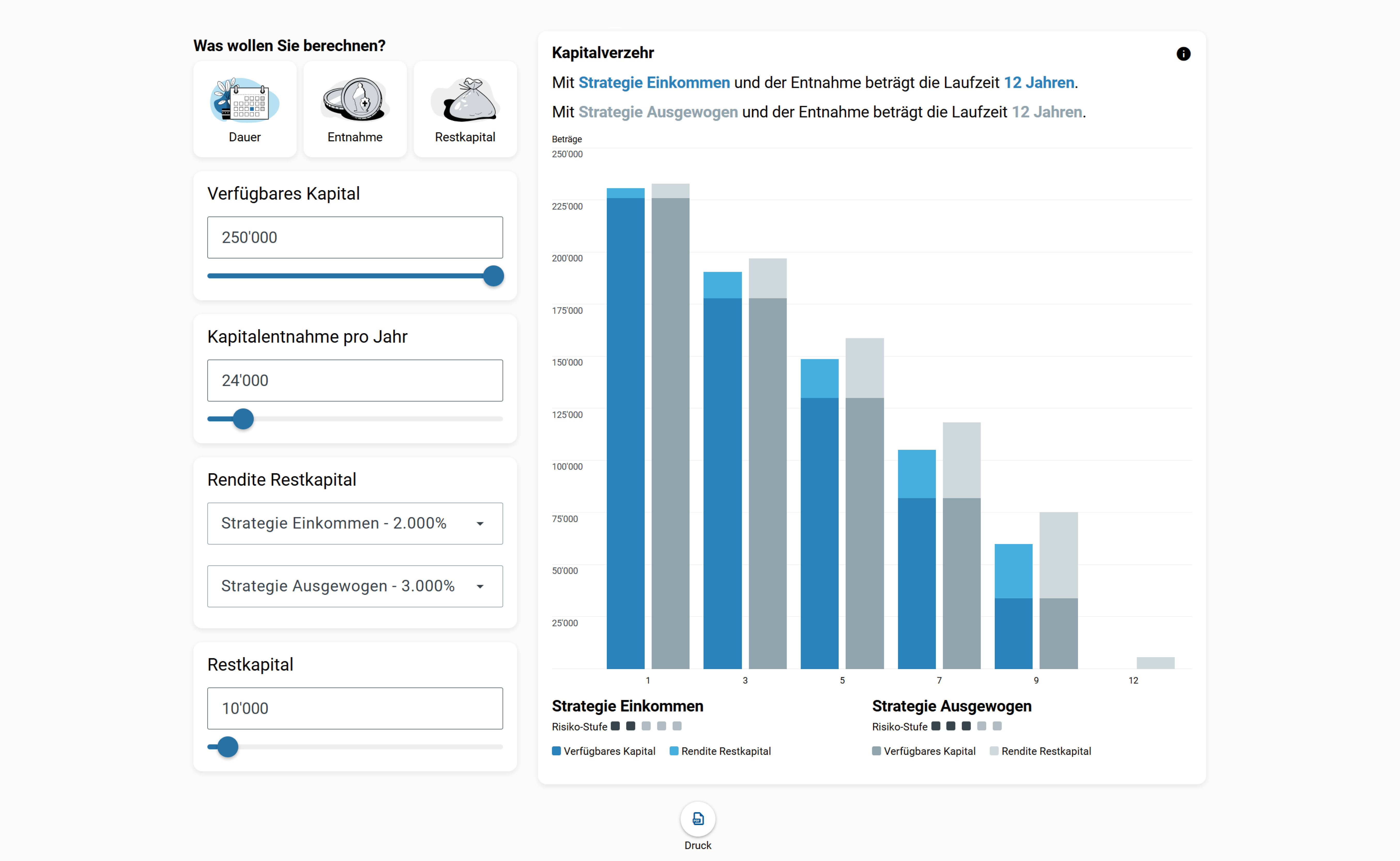 Wie lange reicht mein vorhandenes Kapital bei einer regelmässigen Kapitalentnahme unter Berücksichtigung der Rendite und des gewünschten Restkapitals? Unterschiedliche Anlagestrategien und deren Rendite können verglichen werden. Zudem können Sie berechnen, wie hoch der Entnahmebetrag ist oder wie viel Restkapital nach einer definierten Dauer noch bleibt.