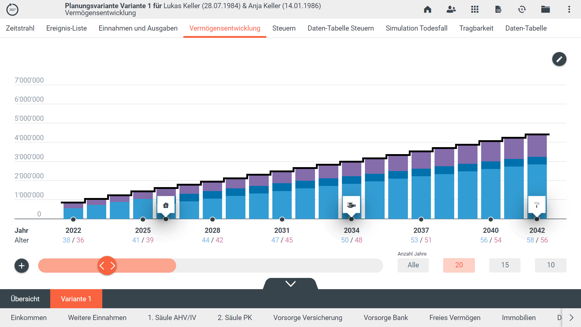 Das Modul Lebens- & Pensionsplanung ist eine auf interaktiven Life-Events und Massnahmen basierte Finanzplanung. Eine ausgeklügelte Variantenfunktionalität ermöglicht es dem Berater, verschiedene Finanzplanungs- und/oder Pensionsplanungsszenarien zu erstellen und zu vergleichen. Die einzelnen Life-Events und Massnahmen können interaktiv bewirtschaftet werden. Sofort werden sämtliche Einkommens- und Vermögensprojektionen prospektiv und retrospektiv aktualisiert. Wahlweise ist das Modul als Lebensplanung oder reduziert auf die Funktionalitäten einer Pensionsplanung einsetzbar.