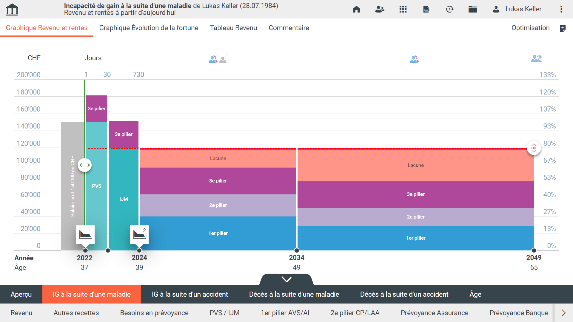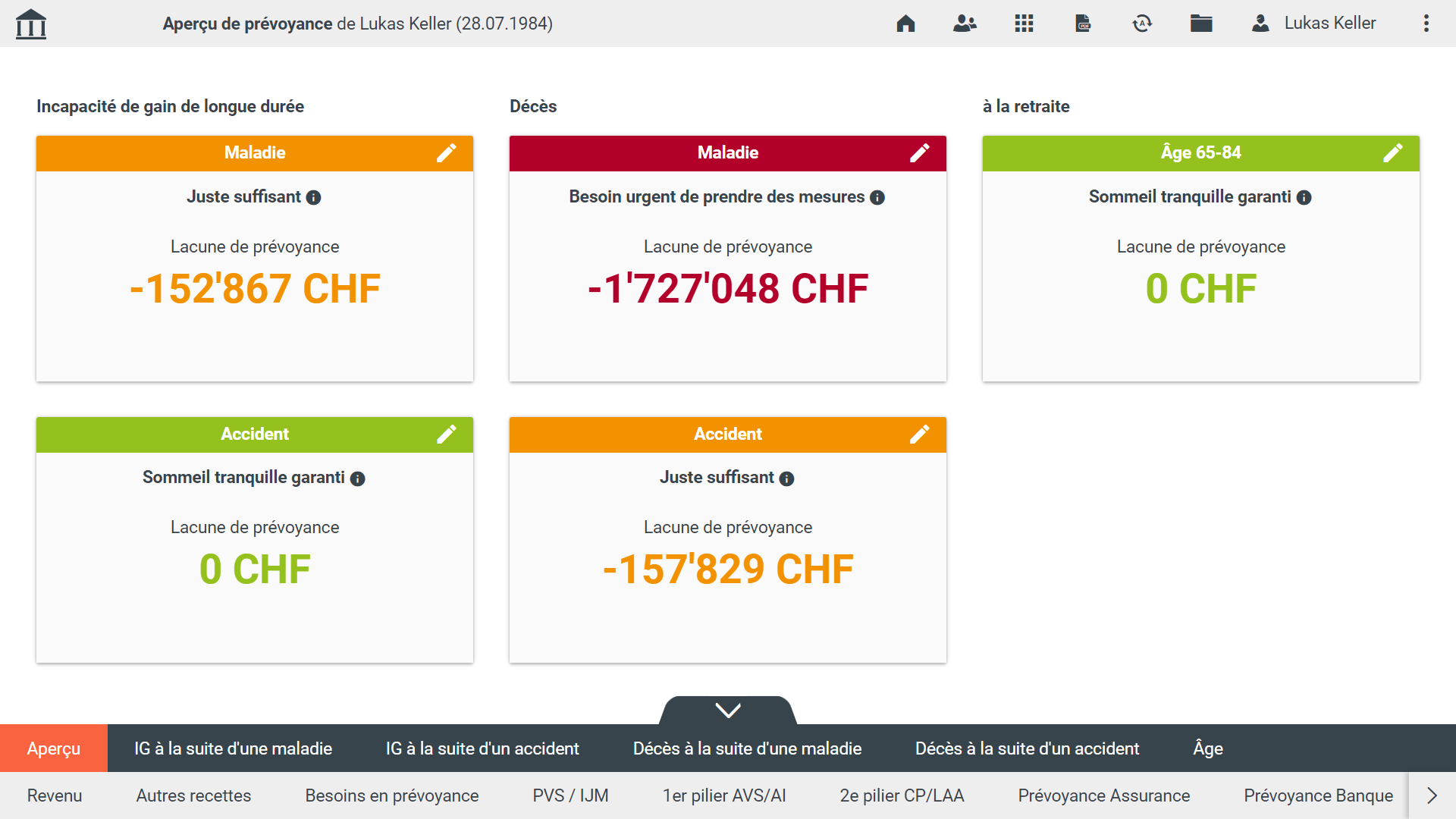Le module Prévoyance permet d'effectuer des contrôles de prévoyance simples ainsi que des analyses de risques complètes. Deux modes configurables (BASIC et PRO) offrent la possibilité d'adapter la profondeur et l'étendue des fonctions aux besoins de chaque rôle.