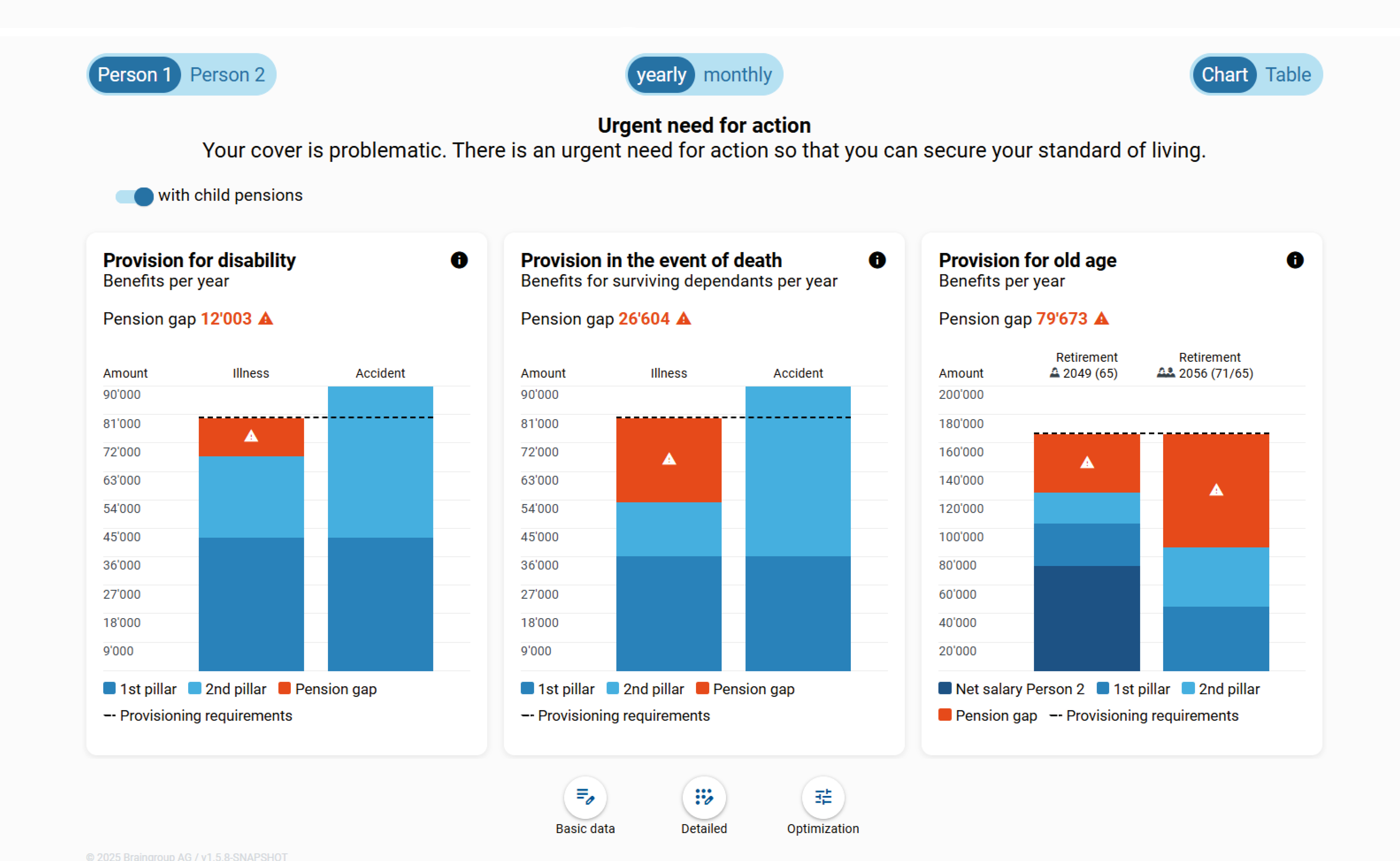 Perform a simple pension check for the risk cases of disability, death, and old age. This compares your pension income with your assumed pension requirements. The difference is shown as the pension gap or pension surplus.
