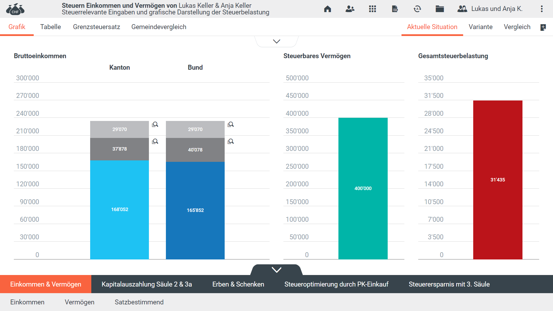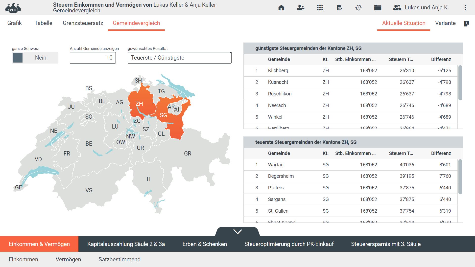 Das Modul Steuern unterstützt verschiedene Steuerarten bei der Analyse der aktuellen Situation und Optimierung. Es können umfassende Vergleiche simuliert und Einsparungen für den Kunden aufgezeigt werden. Die Steuerdaten werden gesamtschweizerisch erhoben und mehrmals jährlich aktualisiert. Das Daten-Sourcing und Aktualisierung erfolgt inhouse.