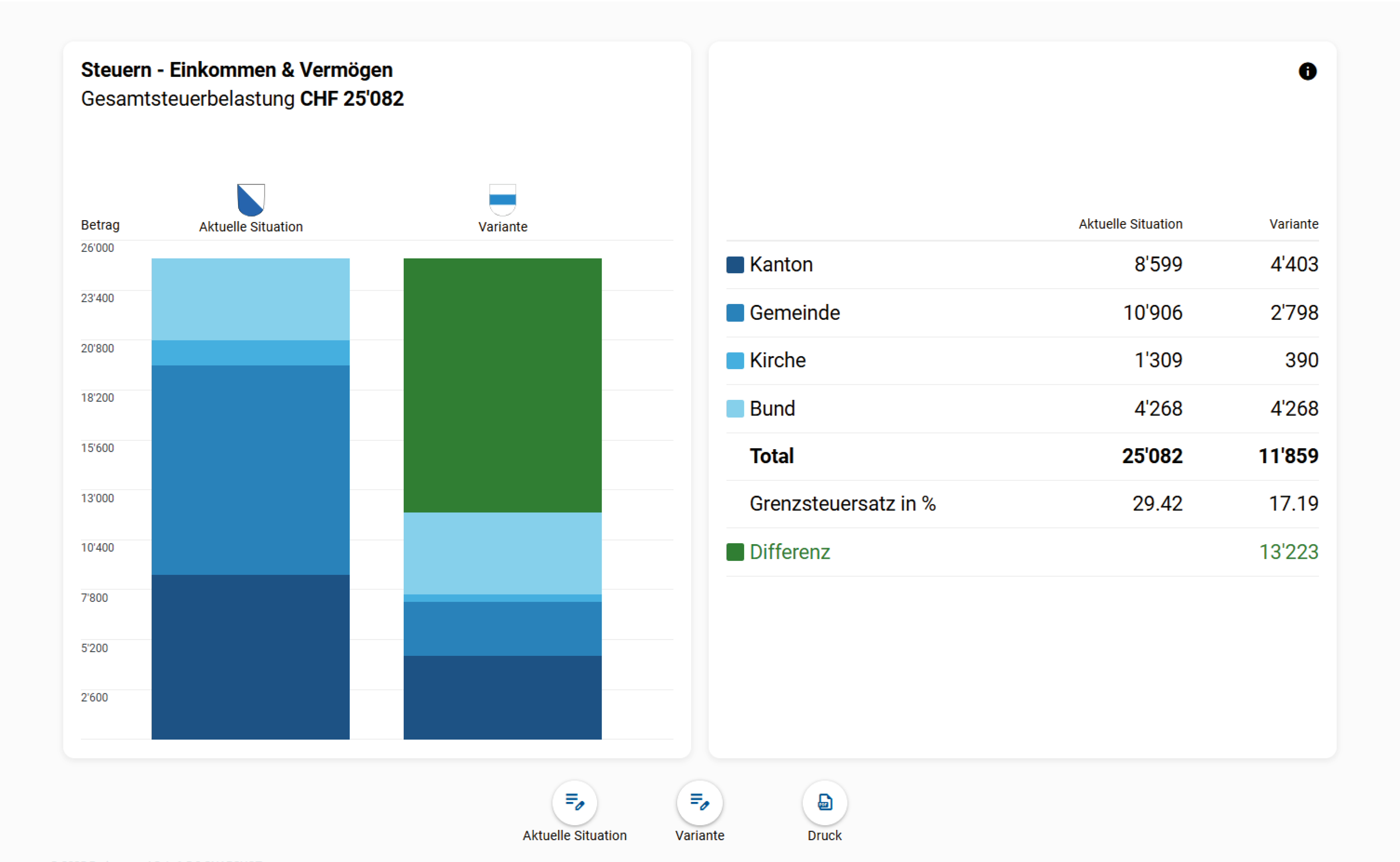 Ermitteln Sie schnell und effizient die Einkommens- und Vermögenssteuern für eine beliebige Wohngemeinde in der Schweiz.