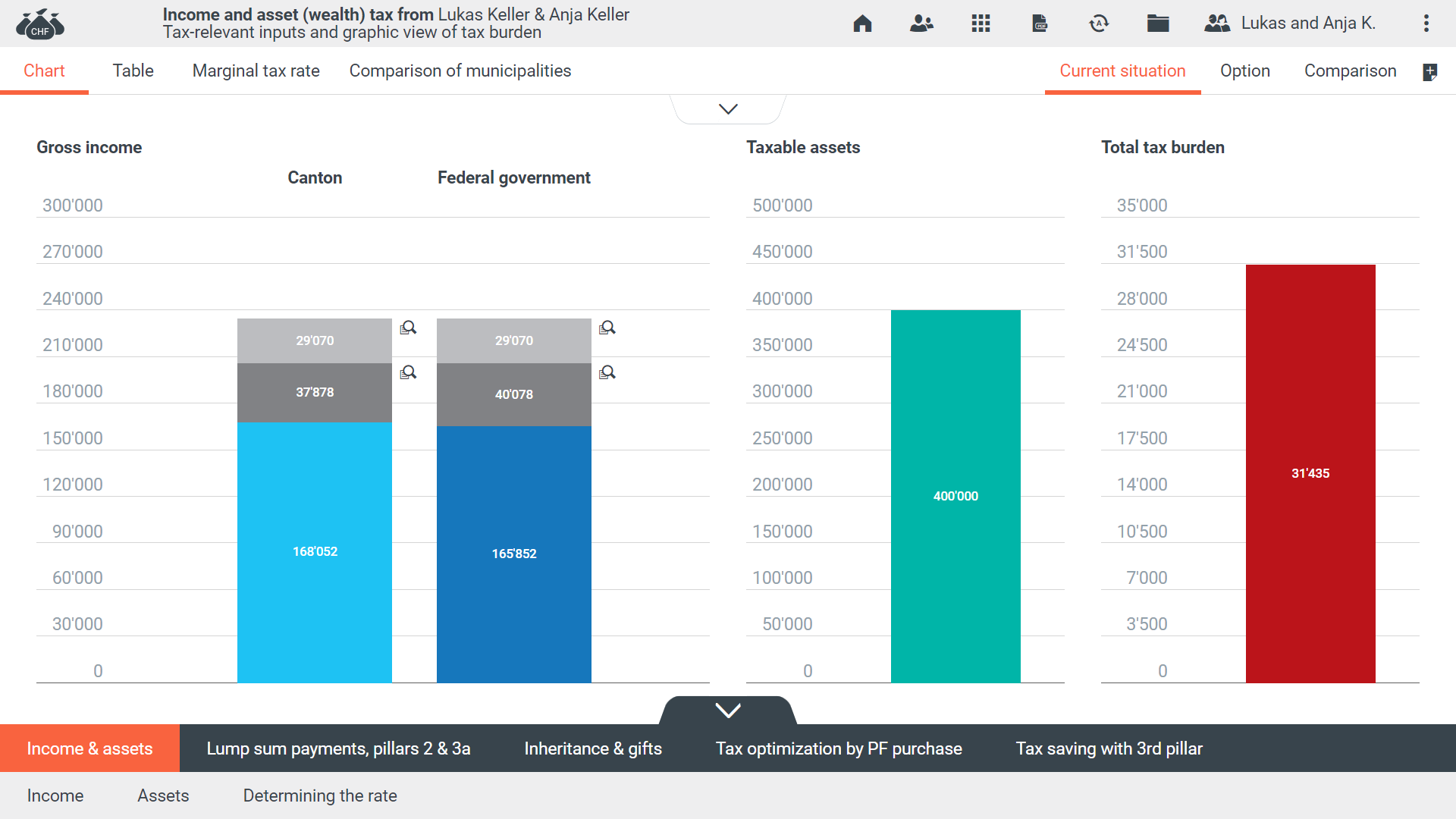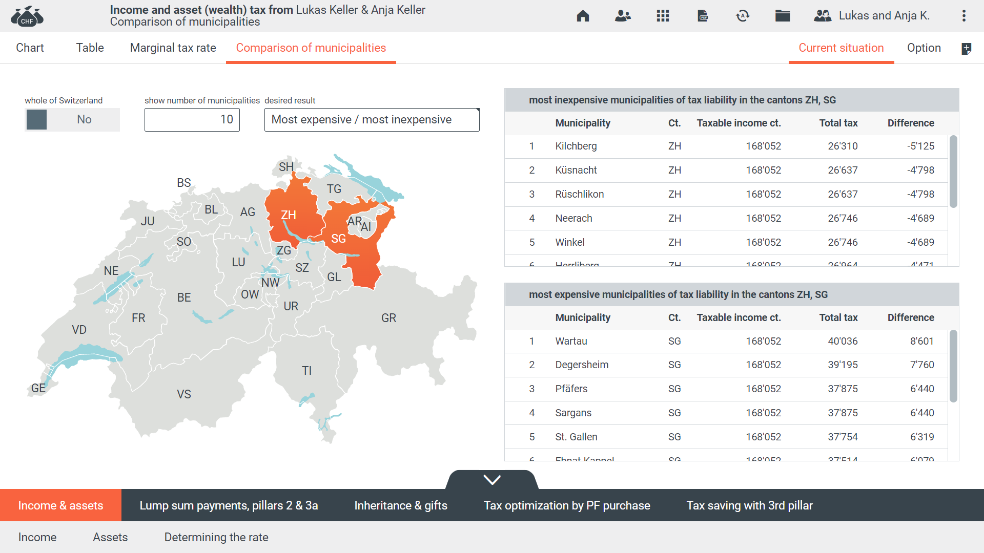 The Tax module supports various types of taxes in analyzing the current situation and optimization. Comprehensive comparisons can be simulated and savings for the customer can be identified. Tax data is collected from throughout Switzerland and updated several times a year. Data sourcing and updating are carried out in-house.
