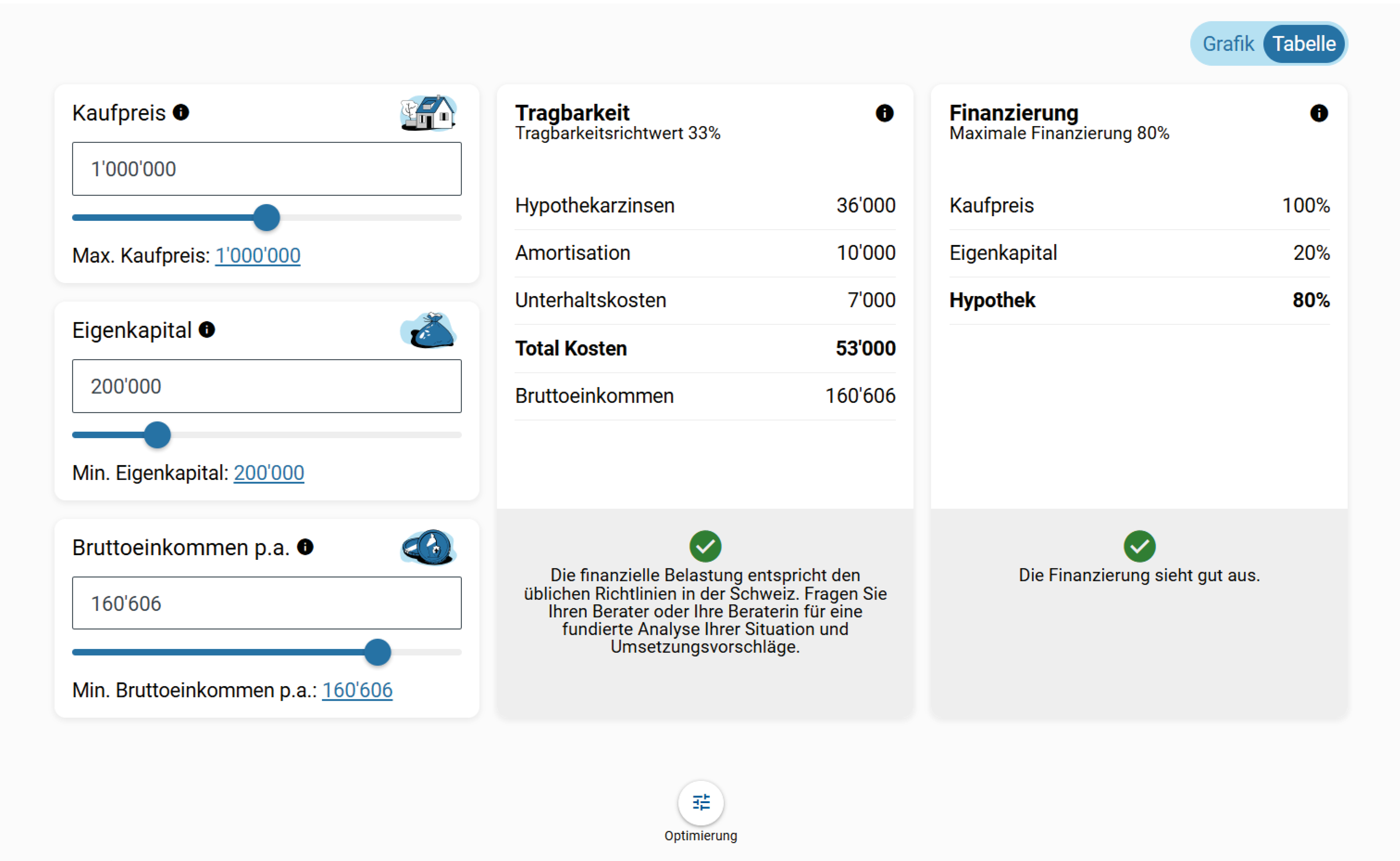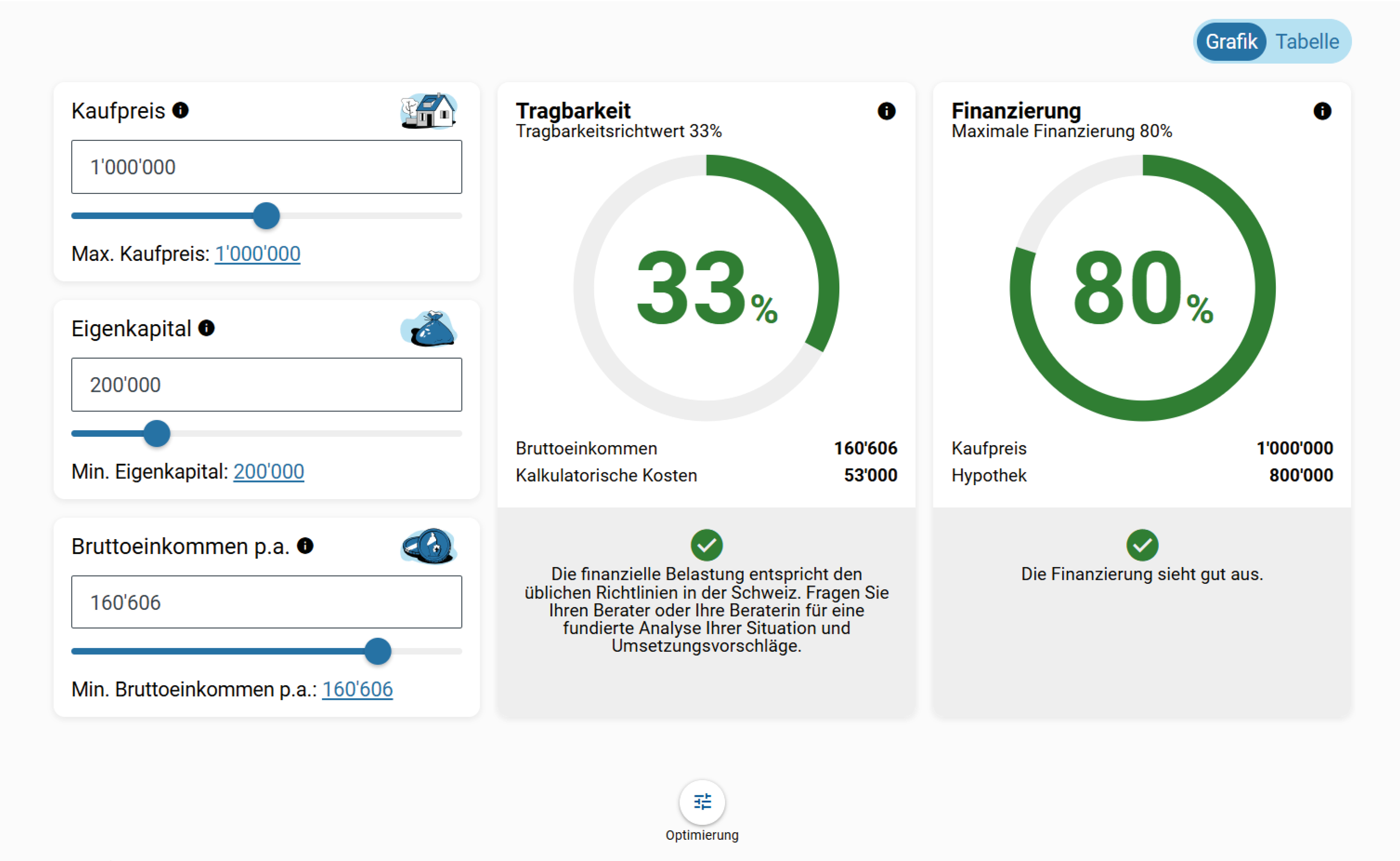 Berechnen Sie mit wenigen Klicks die Tragbarkeit einer Immobilienfinanzierung. Die Tragbarkeit sowie die Belehnung werden dabei anhand des Kaufpreises, der Eigenmittel und des Bruttoeinkommens berechnet. Ausserdem liefert der Rechner die Antwort auf folgende Fragen: