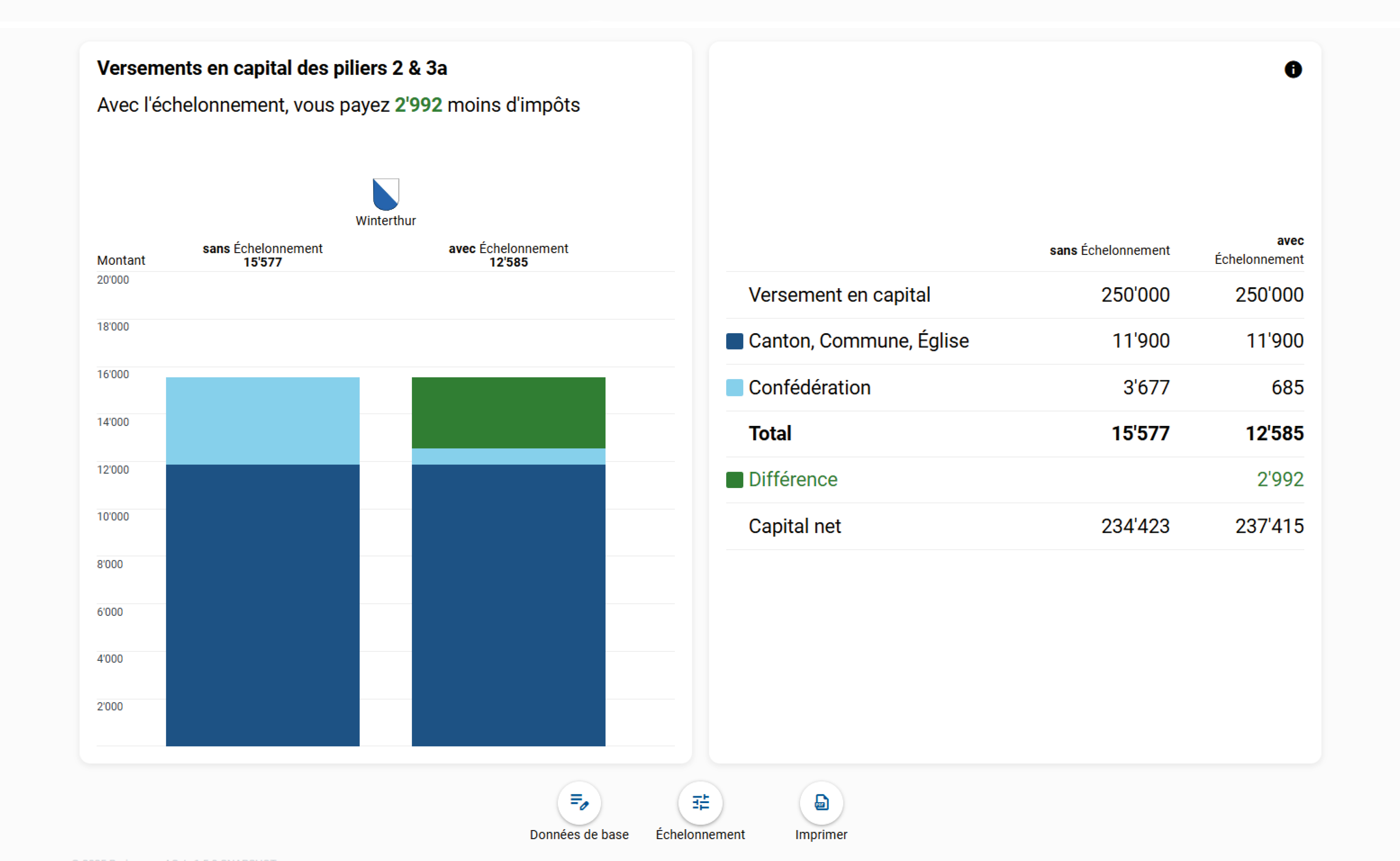 En quelques clics, vous pouvez calculer les impôts sur les versements en capital de la prévoyance liée (piliers 2 et 3a) dans n'importe quelle commune de Suisse.